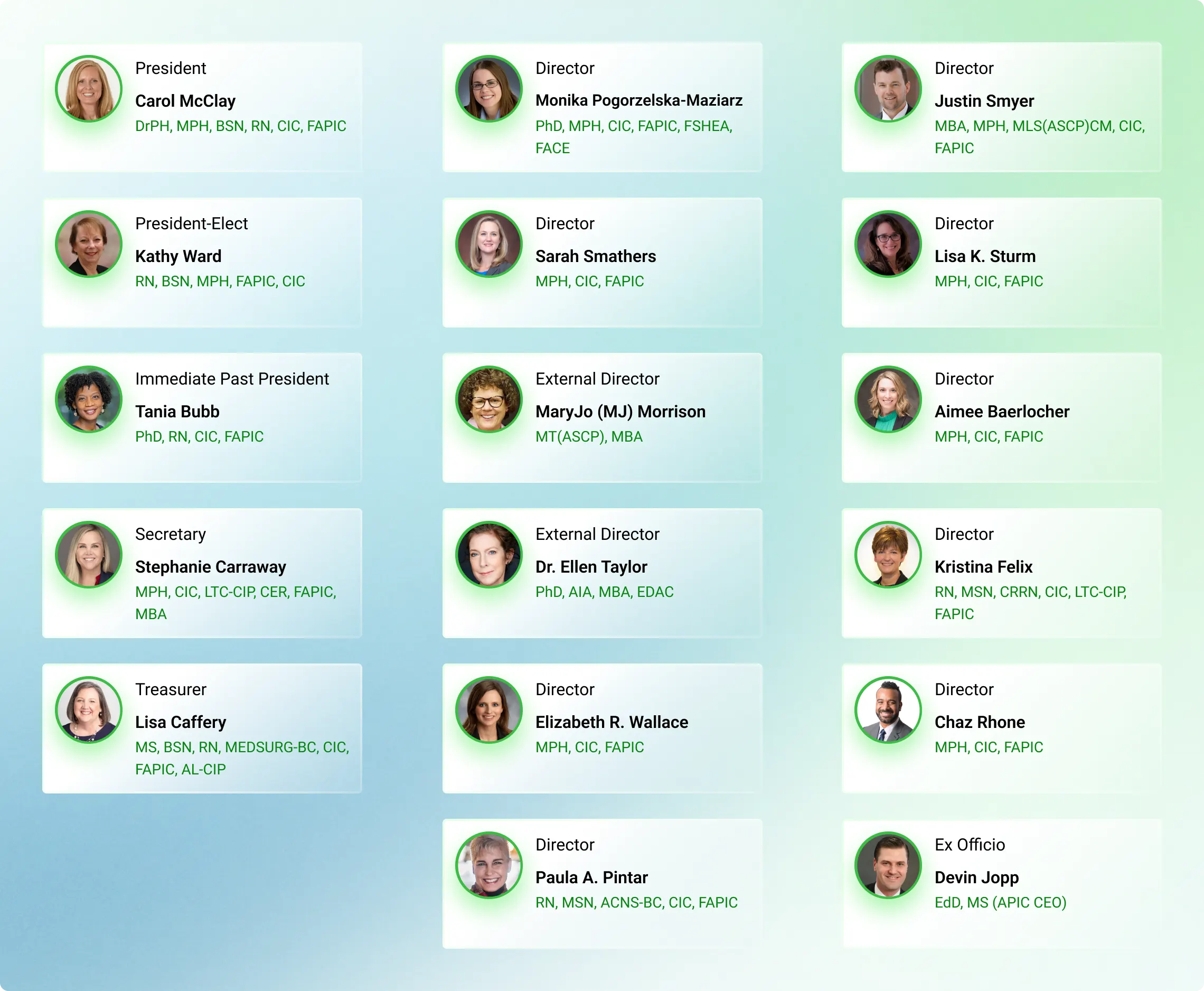 - The board is responsible for positioning the association to best serve APIC members as well as maintaining the focus and vision to improve the practice and management of infection prevention.